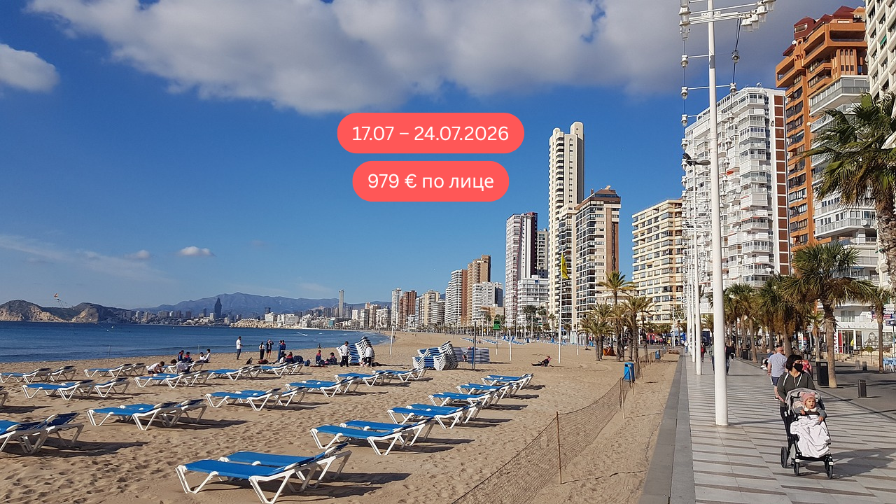 Сончева медитеранска дестинација каде златните плажи, живата атмосфера и модерниот дух се спојуваат во совршен одмор за сите сетила. Познат по својата пријатна клима, долги песочни плажи и динамичен ритам, градот со гордост го носи прекарот „Менхетен на Медитеранот“. Бенидорм привлекува посетители од целиот свет кои сакаат идеална комбинација од релаксација, забава и богато културно искуство.